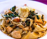 Homemade wide ribbon pasta with our delicious chicken meat sauce & porcini mushrooms.